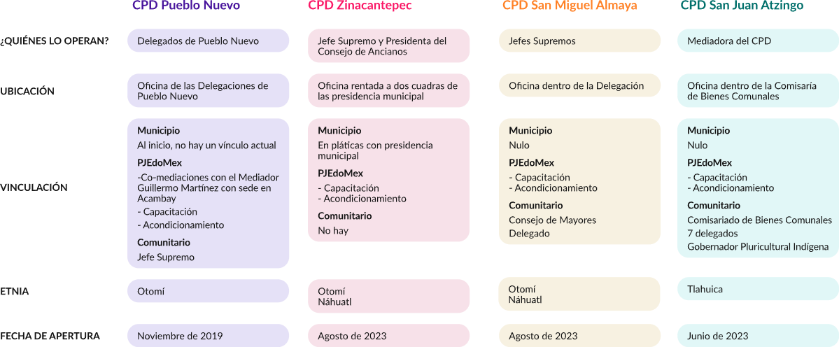 Las herramientas y conocimiento legal con los que cuentan estos operadores(as) varían, pues los CPD de Pueblo Nuevo y de San Juan Atzingo son abogados(as), en contraste con los de Zinacantepec y San Miguel Almaya. Varía, también, el nivel de capacitación que recibieron los operadores por parte del Centro de Mediación del PJEdoMex en materia de mecanismos alternativos, técnicas de comunicación y de resolución de conflictos.