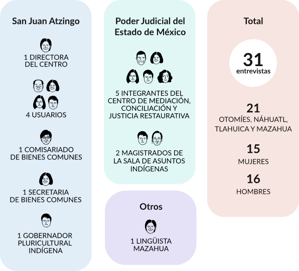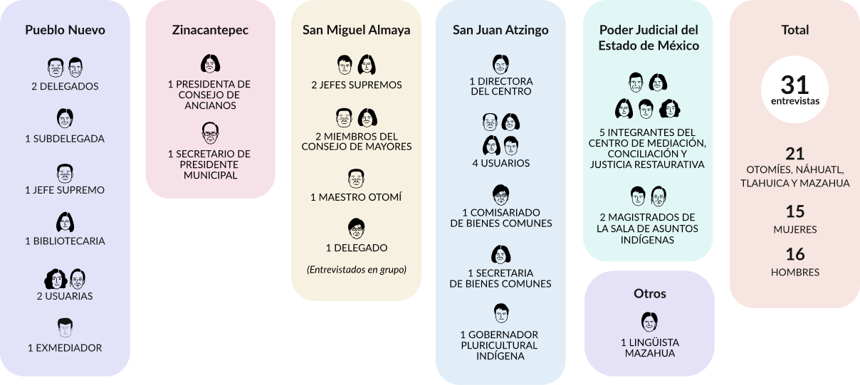 Esta investigación es puramente cualitativa y se construyó, esencialmente, a partir de entrevistas semiestructuradas, realizadas a quienes actualmente se encuentran implicados en los Centros, así como a las personas involucradas en su surgimiento y operación, tanto de las comunidades indígenas en donde se abrieron como del PJEdoMex.