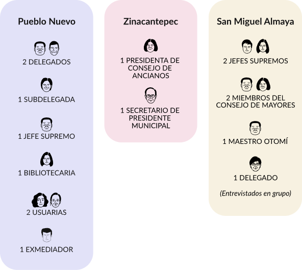 El trabajo de campo se realizó en cuatro comunidades indígenas: Pueblo Nuevo, Acambay (otomí); Zinacantepec (náhuatl y otomí); San Miguel Almaya, Capulhuac (náhuatl y otomí) y San Juan Atzingo, Ocuilan (Tlahuica), en los meses de septiembre y octubre de 2023. Durante las visitas a los Centros, el perfil y número de personas entrevistadas en cada comunidad varió sustancialmente, por dos razones principales, el tiempo que los Centros llevan operando y las autoridades comunitarias que están implicadas en su operación.